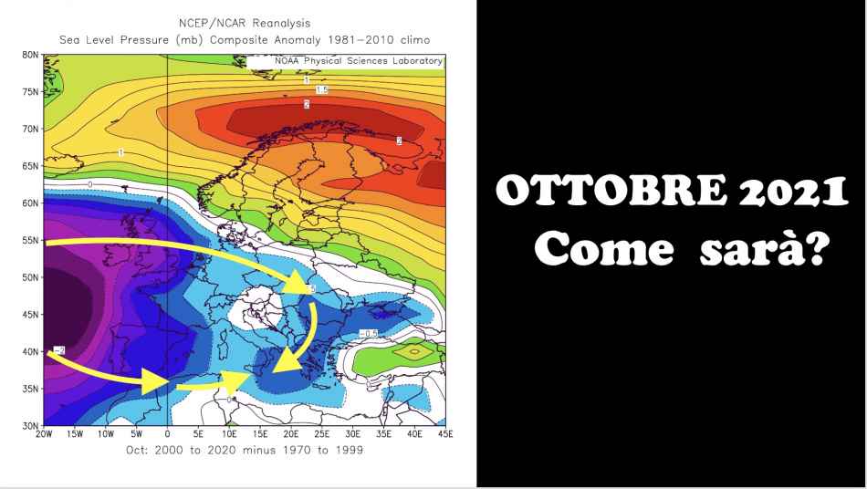 La temperatura in ottobre è aumentata di circa +1.0°C circa rispetto al periodo 1970-1999, un evidente effetto del Global Warming. Aumento molto modesto sulle regioni del medio-alto Adriatico, per effetto dei venti di Bora, richiamati dalle depressioni che atlantiche che raggiungono il Meridione. Le annate con ottobre molto caldo nel periodo 2000-2020 sono state 5 (2001,2004,2012, 2013, 2014, 2018) a fronte di solo 3 annate nel periodo 1970-1999. I mesi di ottobre molto freddi sono stati 3 (2003, 2007, 2010); pari numero nel periodo 1970-1999. L‘aumento di temperatura è comunque di gran lunga più contenuto che nelle altre stagioni, perché, nonostante tutto, l’Autunno resta la stagione più piovosa cosicché nubi e piogge tendono a mantenere più contenute le temperature.