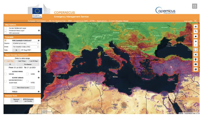 Il Mediterraneo. Molti paesi del Mediterraneo orientale e centrale hanno sofferto gli effetti di incendi intensi durante i mesi di luglio e agosto, con nubi di fumo chiaramente visibili nelle immagini satellitari, così come nelle analisi e previsioni CAMS per la zona del bacino Mediterraneo. Mentre il sud-est Europeo ha vissuto condizioni di ondate di calore prolungate, i dati CAMS hanno mostrato una intensità giornaliera degli incendi che ha raggiunto i suoi più alti livelli dal 2003, come da dataset GFAS. In seguito agli incendi in Turchia, altri paesi della regione, come Grecia, Italia, Albania, Nord Macedonia, Algeria e Tunisia, sono stati colpiti da incendi devastanti. In agosto, gli incendi hanno interessato anche la Penisola Iberica, colpendo vaste zone della Spagna e del Portogallo, e in particolare una ampia area vicino a Navalacruz, nella provincia di Avila, poco più ad ovest di Madrid. Incendi estesi sono stati registrati anche a est di Algeri, nel nord dell’Algeria, dove le previsioni del CAMS GFAS hanno mostrato alte concentrazioni superficiali dell’inquinante particolato fine PM2.5.