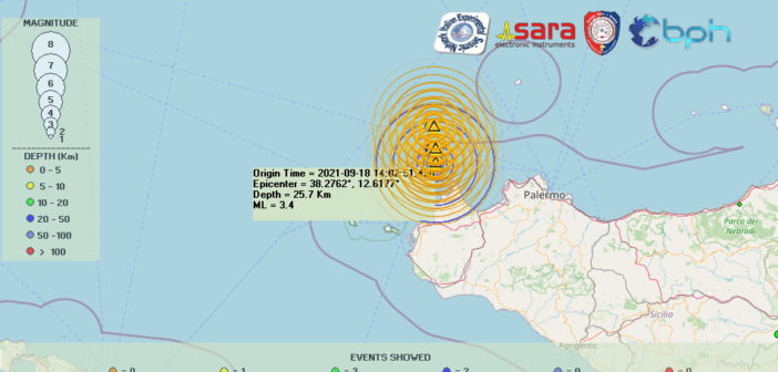 Due scosse di terremoto di magnitudo (Ml) 3.4 e una di (Ml) 3.0 sono state registrate rispettivamente, alle ore  16:02:51, alle ore 14:19:32 e alle 13:12:03 nella zona a nord della costa Trapanese in Sicilia, con ipocentri rispettivamente alla profondità di 25, 28 e 11 km.