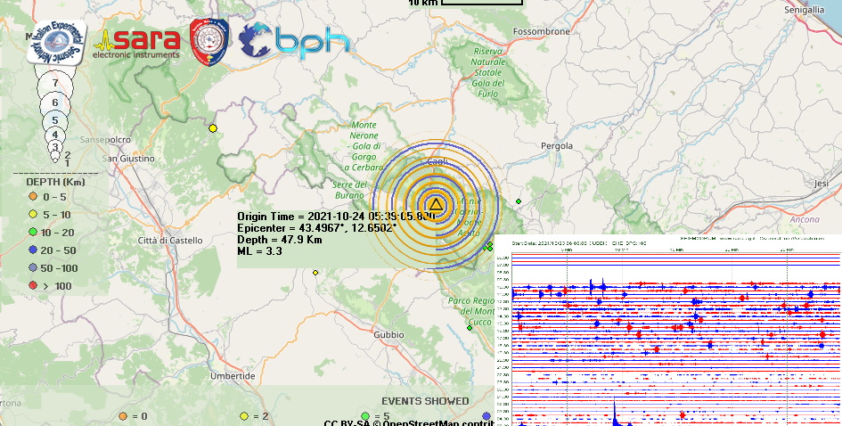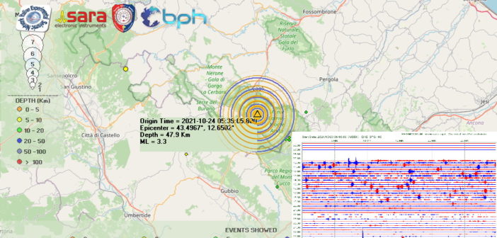 Un terremoto di magnitudo (Ml) 3.3 è avvenuto alle ore 07:39:05 ed è stato localizzato nella zona di Cantiano (PU) nelle Marche, con ipocentro alla profondità di 48 km.