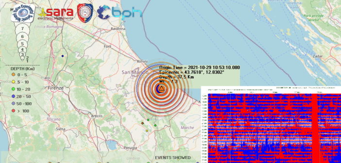 Un terremoto di magnitudo Ml 4.3 (Mw 4.1) è avvenuto alle ore 12:53:10 ed è stato localizzato nella zona di Montefelcino (PU) nelle Marche, con ipocentro alla profondità di 38 km