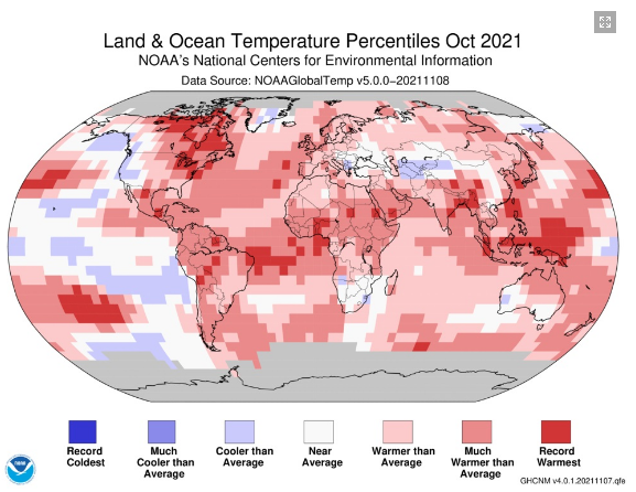 Infatti, La temperatura superficiale globale di ottobre 2021 è stata di 0,89° C al di sopra della media del XX secolo di 14,0° C, il quarto ottobre più caldo in 142 anni. Solo gli ottobre del 2015, 2018 e 2019 sono stati più caldi. Gli ultimi 8 ottobre (2014-2021) sono tutti tra gli 8 ottobre più caldi mai registrati. Ottobre 2021 ha segnato anche il 45° ottobre consecutivo e il 442° mese consecutivo con temperature, almeno nominalmente, superiori alla media del XX secolo.