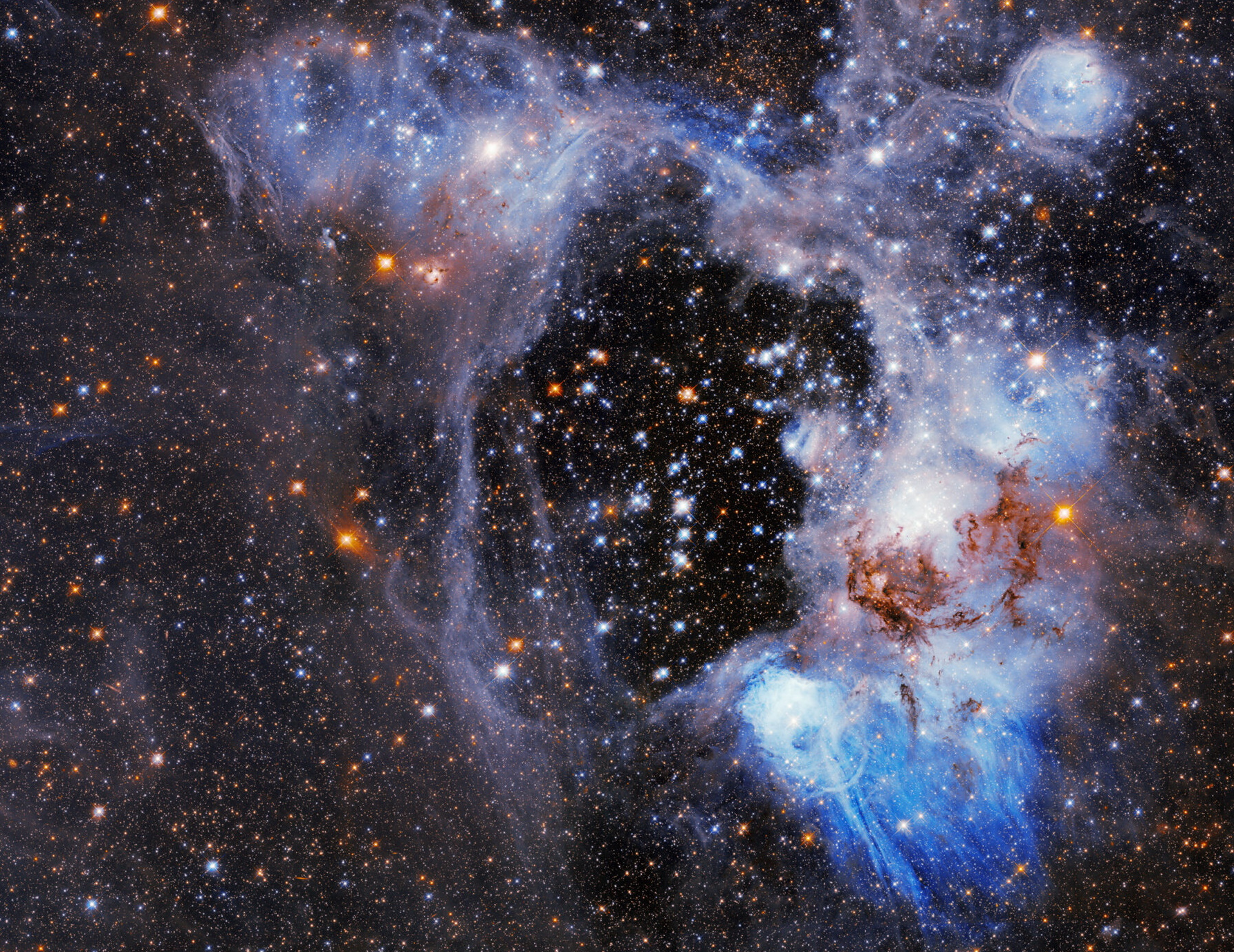 Si tratta di una nebulosa complessa piena di idrogeno gassoso incandescente, scure strisce di polvere, stelle massicce e molte popolazioni stellari di età diverse. Una delle sue caratteristiche più distintive, tuttavia, è la zona scura denominata superbolla, visibile nella regione centrale superiore dell’immagine proposta in questa pagina, ripresa del telescopio spaziale Hubble. Questa “cavità” è larga circa 250 anni luce e la sua presenza è ancora un mistero. I venti stellari espulsi da stelle massicce all’interno della bolla potrebbero aver allontanato il gas, ma questa eventualità non sembra essere coerente con le velocità del vento misurate nella bolla. Un’altra possibilità, dal momento che la nebulosa è piena di stelle massicce che terminano la loro vita con gigantesche esplosioni, è che i gusci in espansione delle vecchie supernove abbiano scolpito la caverna cosmica.