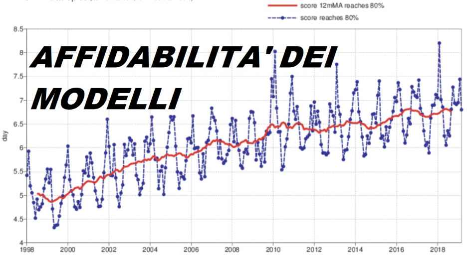 Il modello operativo HRES (High RESolution) fornisce una descrizione molto dettagliata fino a pixel di 13 km delle condizioni meteofuture giorno per giorno. E’ la previsione più accurata per un certo periodo, che attualmente è stimata in 10 giorni per le proprietà su larga scala dell’atmosfera. Ha una affidabilità dell’80% fino a quasi 7 giorni (altro che 3 giorni!), come mostra l’immagine doi coperina. Ma oltre la settimana e mezza l’affidabilità scende 65% circa ovvero il modello HRES non è più utilizzabile oltre la soglia dei 10gg: ecco che andare sui 12-14 gg può risultare un azzardo. Il che non dice che la tendenza è errata, ma è semplicemente soggetta a…errori e ricalcoli!