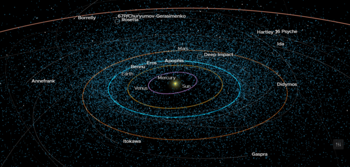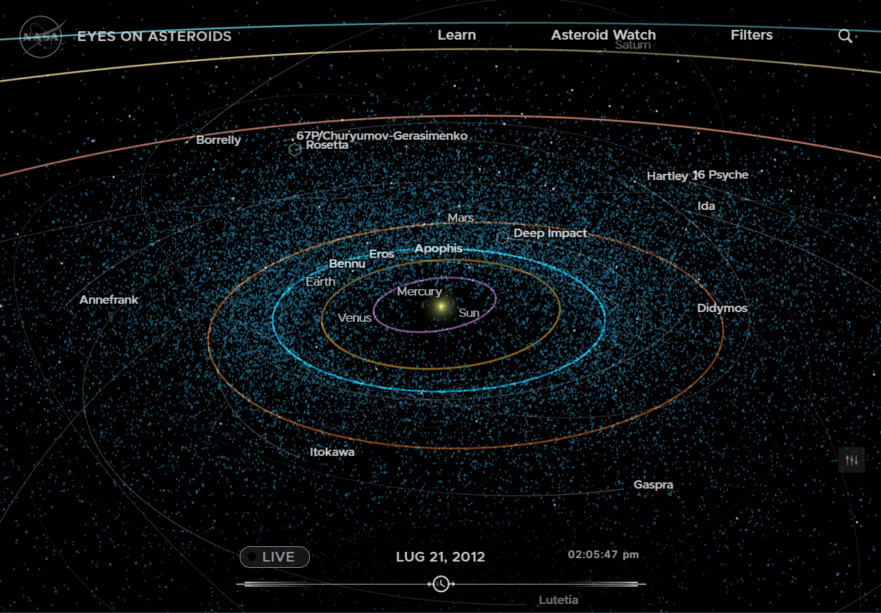 Grazie a un nuovo strumento di visualizzazione 3D della Nasa, è ora possibile esplorare quasi in tempo reale gli asteroidi e le comete che si avvicinano alla Terra con un semplice click o uno swipe del dito su uno schermo touch. Si chiama Eyes on Asteroids e funziona su qualsiasi smartphone, tablet o computer dotato di una connessione internet, senza bisogno di alcun download.