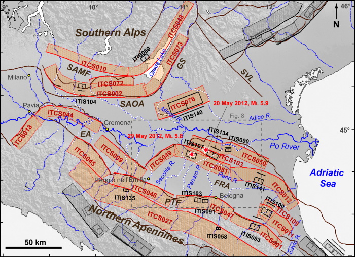 “Tutti questi eventi sono indissolubilmente legati alla sismotettonica regionale. Nella Pianura Padana il contesto tettonico è regolato dal movimento della microplacca Adria che scorre al di sotto della placca euroasiatica”, scrivono i due geologi nel proprio articolo. “Il movimento di Adria, tuttora in atto – aggiungono Petrucci e Balocchi – concorre all’accumulo di energia ed al conseguente rilascio con la formazione di terremoti anche di grande intensità. Grazie ai profili sismici della zona, molti dei quali realizzati dall’AGIP, si evince che l’area di subduzione, ovvero la superficie inclinata per cui una placca scorre al di sotto dell’altra, detta “piano di Benioff”, in questo caso si immerge di circa 70° in direzione sud-ovest, nel margine compreso tra Reggio Emilia e la valle del Reno. Una caratteristica essenziale del “piano di Benioff” è di essere sede privilegiata di terremoti”.
