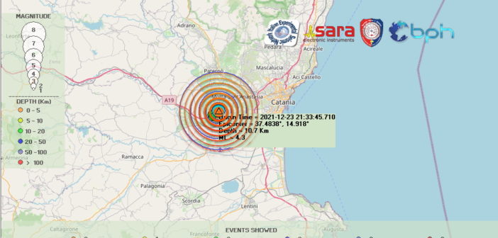 Una scossa di terremoto di Ml 4.3 è stata registrata alle ore 22:33:45 nella zona di Catania in Sicilia, con ipocentro alla profondità di circa 11 km. Evento preceduto da altre scosse, la più forte, di Ml 3.3
