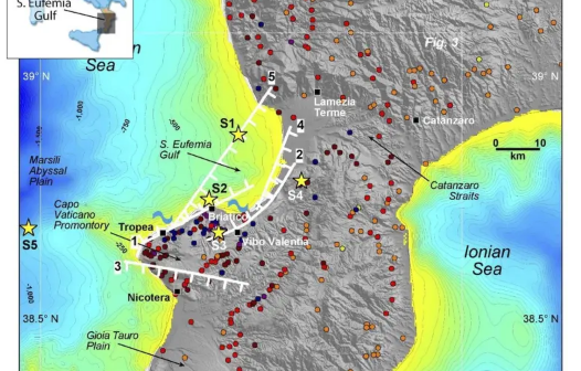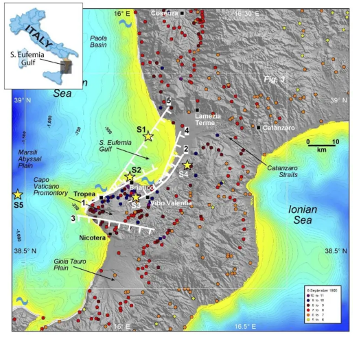 Nonostante si tratti di un terremoto relativamente recente, la sua posizione – a ridosso della costa – e le poche registrazioni sismometriche – di qualità scarsa per via dell’età di acquisizione -, non permettono di individuare con certezza l’epicentro del terremoto dell’8 settembre 1905. Naturalmente, anche le stime di magnitudo risentono degli stessi limiti e forse anche altre conoscenze sulla sorgente sismogenetica più plausibile sono ancora da acquisire o integrare. In tal senso, un nuovo lavoro (Fig. 7) da poco pubblicato da Corradino et al. (2021) introduce una nuova interpretazione dell’assetto tettonico del Golfo di Sant’Eufemia e della sua eventuale interazione con la ricostruzione a suo tempo proposta da Loreto et al. (2013).