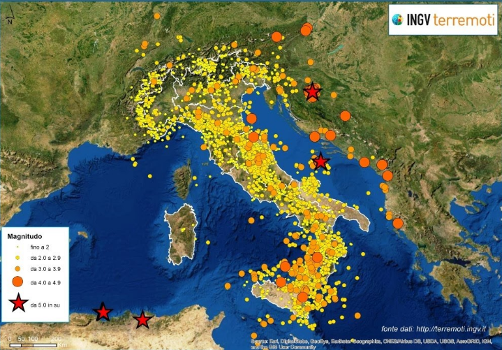 “Anche nel 2021 si è confermato il trend degli ultimi tre anni, con i terremoti più forti localizzati al di fuori del territorio italiano”, afferma Alessandro Amato, sismologo dell’INGV. “Come si vede dalla mappa pubblicata su INGVterremoti, gli eventi sismici che hanno fatto registrare una magnitudo pari o superiore a 5.0 sono avvenuti in Algeria, in Croazia e nel Mare Adriatico, anche se alcuni di essi hanno avuto un risentimento anche nel territorio italiano”.
