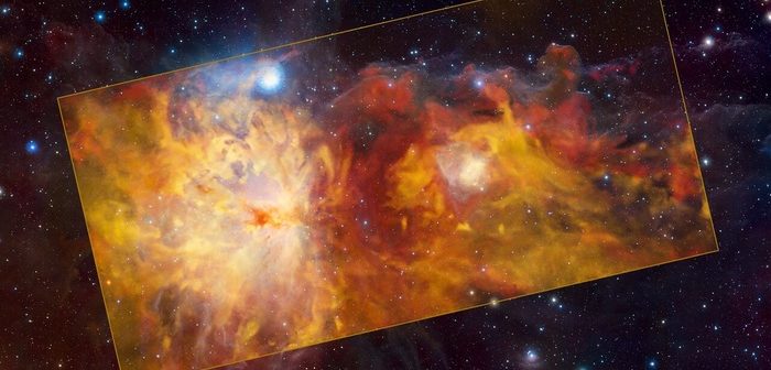 “Come amano dire gli astronomi, ogni volta che c’è in giro un nuovo telescopio o uno strumento, osserva Orione: ci sarà sempre qualcosa di nuovo e interessante da scoprire!”, ha commentato Thomas Stanke, responsabile di quello scatto. La regione di Orione ospita le nubi molecolari giganti più vicine al Sole: vasti oggetti cosmici costituiti principalmente da idrogeno, dove si formano nuove stelle e sistemi planetari. Queste nubi sono distanti tra 1.300 e 1.600 anni luce e rappresentano le culle di stelle più attiva nelle vicinanze del Sistema Solare. Tra queste c’è la Nebulosa Fiamma, al centro dell’immagine, che ospita un ammasso di giovani stelle che emettono radiazioni ad alta energia che fanno risplendere i gas circostanti. A differenza di quanto potrebbe suggerire il nome, la Nebulosa Fiamma e le sue simili sono in realtà molto fredde, con temperature in genere di solo poche decine di gradi sopra lo zero assoluto.