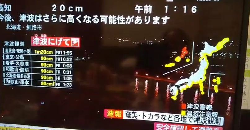 È stato confermato uno tsunami di 1,2 metri nelle isole Amami e Tokara, con la possibilità che le onde raggiungano localmente i 3 metri.
