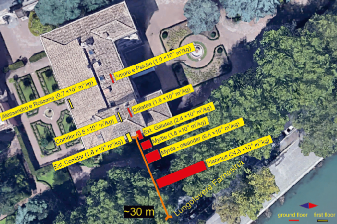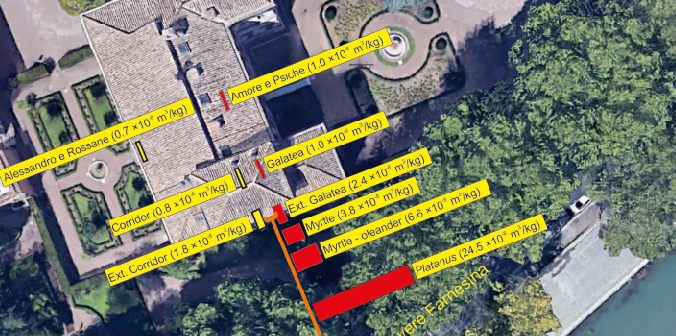 A Villa Farnesina, sede di rappresentanza dell’Accademia Nazionale dei Lincei, le logge affrescate da Raffaello si trovano distanti oltre 30 m dalla principale strada limitrofa, Lungotevere Farnesina, con piante e alberi presenti sia all’esterno che nei Giardini della Villa. Mentre nelle foglie campionate dagli alberi e dalle piante sono state rilevate polveri metalliche automobilistiche con concentrazioni dipendenti dalla distanza dalla strada, nei licheni esposti per tre mesi all’interno delle logge non sono stati riscontrati accumuli importanti di tali particolati. La distanza delle logge dalla strada e la presenza di alberi hanno fortemente ridotto l’impatto del particolato inquinante sulle sale affrescate: le foglie degli alberi, soprattutto dei platani sul Lungotevere, hanno ritenuto le polveri metalliche, emesse principalmente ai freni veicolari, fornendo così un importante servizio di protezione delle opere d’arte contenute nella Villa.