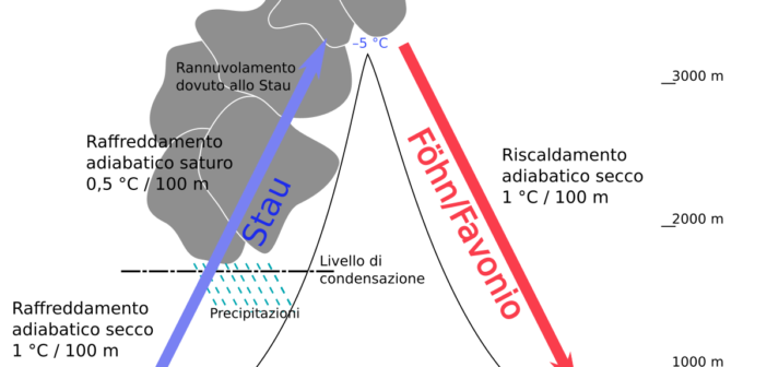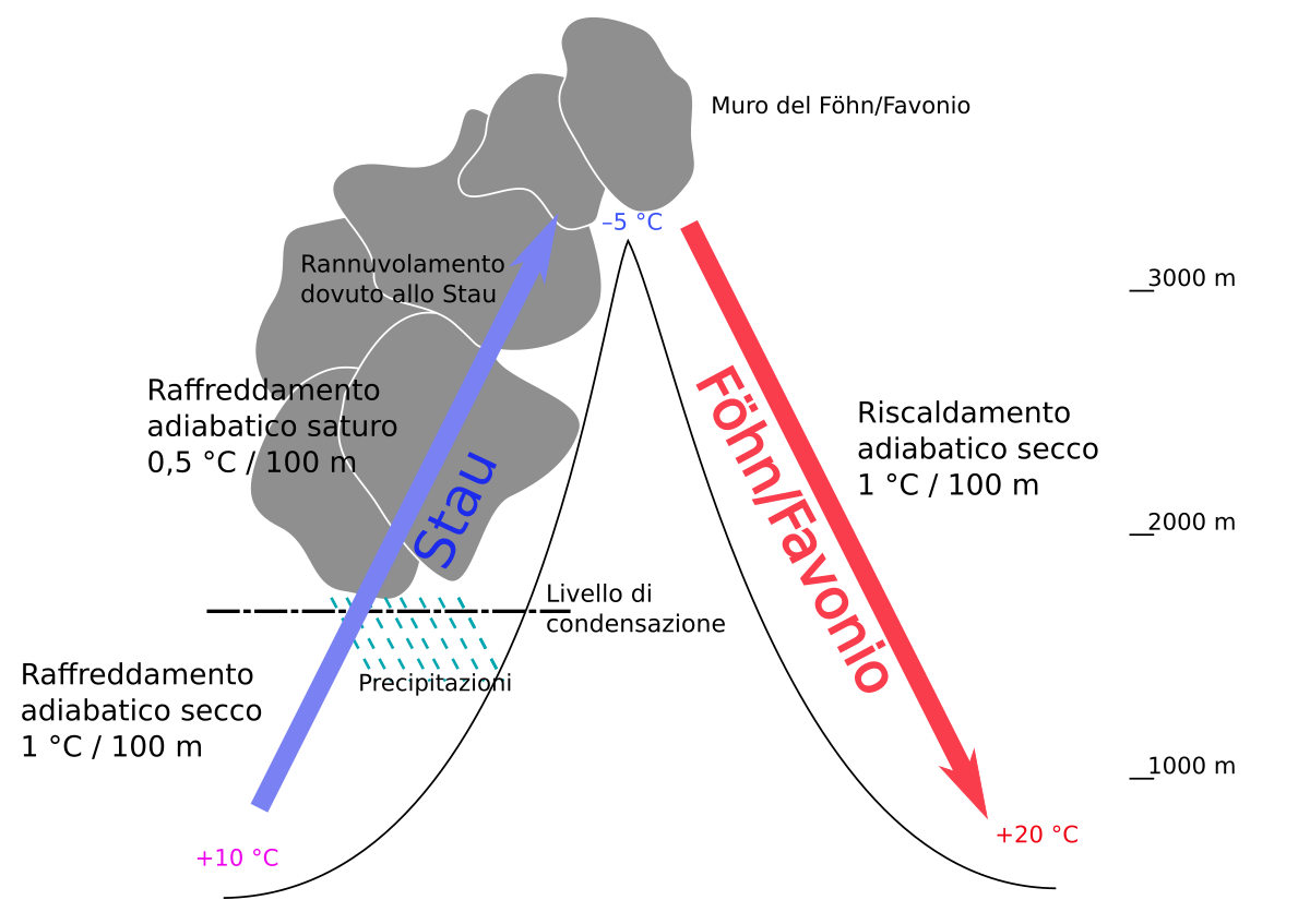 Questo movimento ascendente dell’aria sul lato sopravvento, con formazione di nubi e precipitazioni, viene denominato Stau.