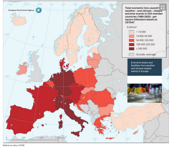 In base agli studi della World meteorological organization, nell’ultimo mezzo secolo le perdite economiche a livello globale dovute ad eventi climatici estremi sono aumentate, ma i dati disponibili non mostrano una chiara tendenza delle perdite per l’Europa negli ultimi 40 annii.Infatti, come evidenzia l’EEA, «Nonostante le raccomandazioni della Commissione europea e di altre organizzazioni internazionali, nella maggior parte degli Stati membri dell’Ue non esiste attualmente alcun meccanismo per raccogliere, valutare o segnalare le perdite economiche dovute a eventi meteorologici e climatici estremi in modo omogeneo e con dettagli sufficienti per sostenere politiche di adattamento». Però, alcune società private raccolgono questi dati e l’EEA ha accesso a 2 di queste fonti private con dati per il periodo 1980-2020: NatCatSERVICE di Munich Re e CATDAT di Risklayer.