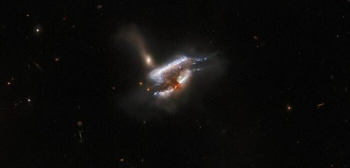 Tra gli oggetti cosmici più interessanti identificati c’era pure IC 2431, che poi si è rivelato essere l’insieme di tre galassie in via di collisione. Nell’immagine catturata da Hubble si vede un violento rimescolamento di stelle in formazione e distorsioni dovute alle interazioni gravitazionali in atto nel ‘trio’. Al centro c’è anche una densa nuvola di polvere, mentre la luce di una galassia sullo sfondo fa capolino alle estremità.