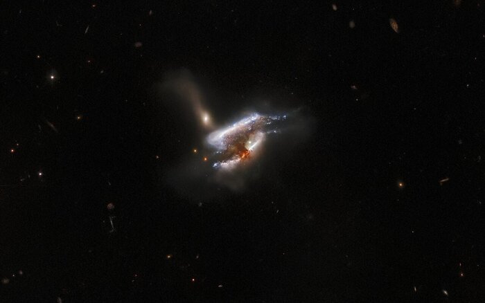 Il celebre telescopio spaziale Hubble di Nasa e Agenzia spaziale europea (Esa) ha immortalato la tumultuosa fusione di tre galassie nella costellazione del Cancro, a 681 milioni di anni luce dalla Terra: avvinghiate tra ammassi di polveri e luminosi vortici di stelle, daranno origine a una galassia figlia che porterà le cicatrici di questa collisione cosmica.