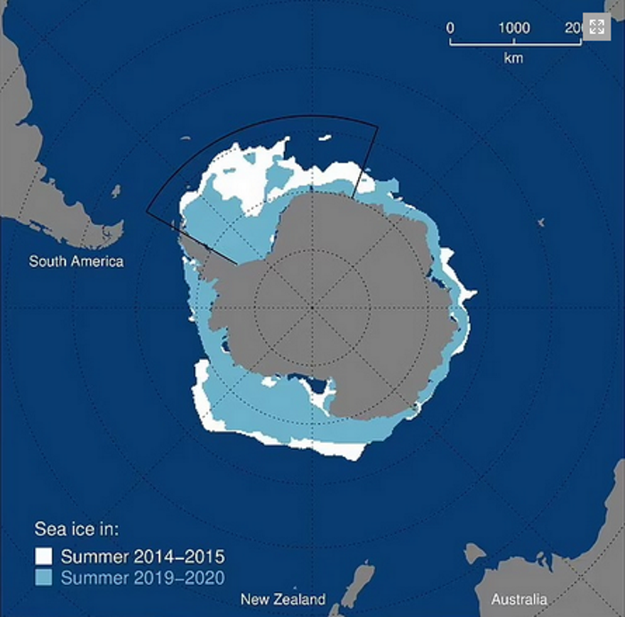 Il ghiaccio marino in Antartide è sceso al livello più basso da quando sono iniziate le registrazioni 40 anni fa. Secondo le nuove misurazioni del National Sea Ice Data Center il ritiro del ghiaccio marino antartico ha superato il precedente minimo record del marzo 2017: 810.000 miglia quadrate (2,1 milioni di Km2i), dopo essere sceso a 765.000 miglia quadrate (1,98 milioni di Km2) il 20 febbraio.