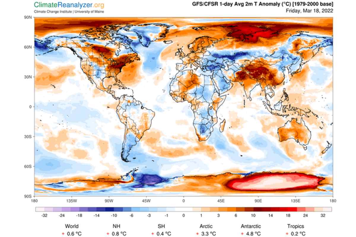 Entrambi i poli della Terra stanno subendo eventi di caldo estremo simultanei: le temperature in Antartide hanno raggiunto livelli record nel fine settimana, in alcuni punti anche i 40°C al di sopra della media. Allo stesso tempo, anche le stazioni meteorologiche vicino all’Artide hanno mostrato segni di scioglimento, con alcune temperature di 30 °C al di sopra del normale.