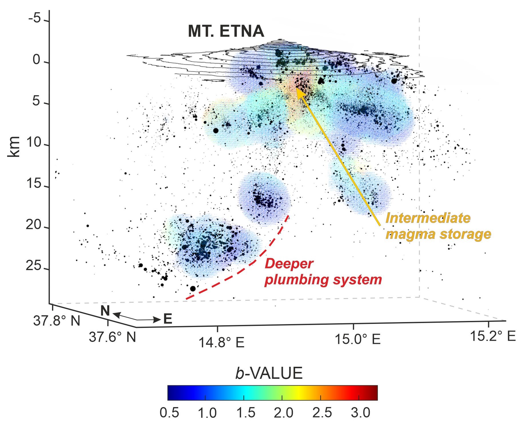 Questo studio ha permesso ai ricercatori di individuare una zona asismica che si estende da una profondità di oltre 30 km fino a circa 10 km al di sotto dell’intera regione etnea, che corrisponde alla parte più profonda del “plumbing system”. Più in superficie è stato invece identificato un serbatoio magmatico intermedio, localizzato tra 1 e 6 km al di sotto del livello del mare, intorno al quale avvengono numerosi terremoti di bassa magnitudo favoriti dall’elevata pressione dei fluidi magmatici e dalle condizioni di diffusa fratturazione della crosta.