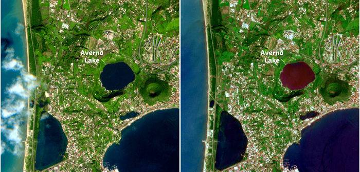 Visto dallo spazio, il lago Averno appare come un piccolo cerchio rosso scuro, nel paesaggio dei Campi Flegrei: le immagini arrivano dal satellite Sentinel 2 del programma Copernicus, gestito da Agenzia Spaziale Europea (Esa) e Commissione Europea.