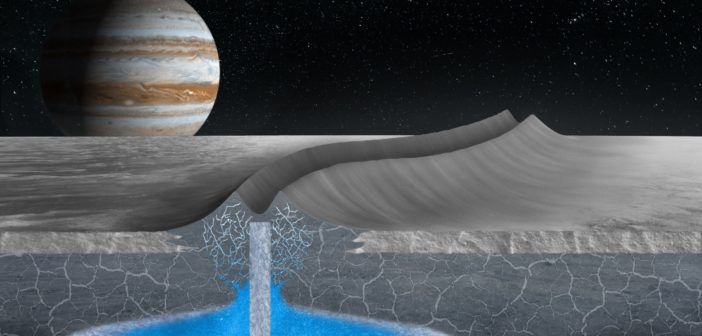Europa, la luna di Giove, è un ottimo candidato per l’abitabilità extraterrestre nel Sistema solare e il suo profondo oceano di acqua salata ha affascinato gli scienziati per decenni. Ma è racchiuso da un guscio ghiacciato che potrebbe essere spesso da qualche chilometro a decine di chilometri, rendendo la prospettiva di un eventuale campionamento alquanto scoraggiante. Tuttavia, ora sembra esserci l’evidenza che il guscio di ghiaccio potrebbe non essere solo una barriera bensì un sistema dinamico e un sito potenzialmente abitabile a sé stante.