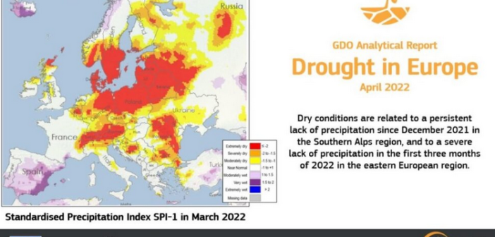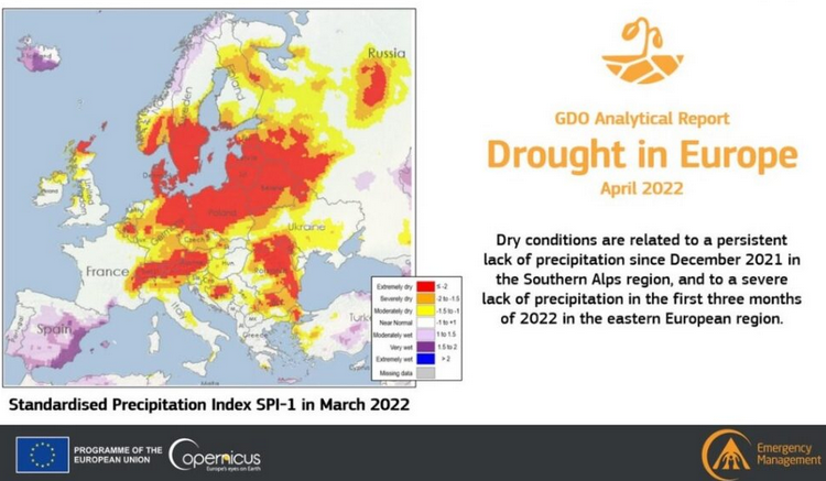 Secondo i dati raccolti nel nuovo rapporto elaborato dal programma di punta per l’osservazione della Terra offerto dall’Unione europea, una «grave siccità» ha colpito vaste aree dell’Europa, in particolare i bacini fluviali del Danubio e del Po, mettendo in difficoltà la produzione agricola come quella di energia idroelettrica. E siamo solo a maggio, con tutta l’estate davanti.