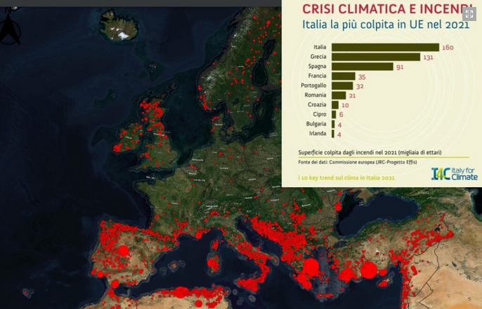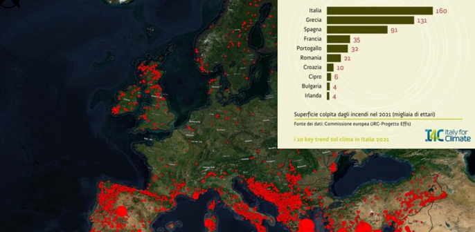 «Gli impatti della crisi climatica, comprese le ondate di calore e gli incendi, sono ormai realtà e l’Italia ne è già particolarmente esposta perché si trova in un hotspot climatico, quello del bacino mediterraneo. E infatti proprio nel 2021 è arrivato un nuovo triste record per l’Italia: è stato il Paese europeo con il più alto numero di incendi e la più ampia superficie percorsa dal fuoco, 160 mila ettari ». A dirlo è Italy forr Climate (I4C) che rilancia i dati dell’”Advance report on wildfires in Europe, Middle East and North Africa 2021” pubblicato dall’European Forest Fire Information System (EFFIS) dell’Unione europea ed evidenzia che «Gli altri due Paesi sul podio fanno sempre parte dell’hotspot mediterraneo e sono la Grecia (con 131 mila ettari) e la Spagna (con 91 mila ettari). Anche per numero di accadimenti l’Italia è stata di gran lunga la più colpita d’Europa: 1.400 incendi hanno colpito il nostro Paese nel 2021, mentre sono stati 900 in Spagna e 750 in Portogallo».