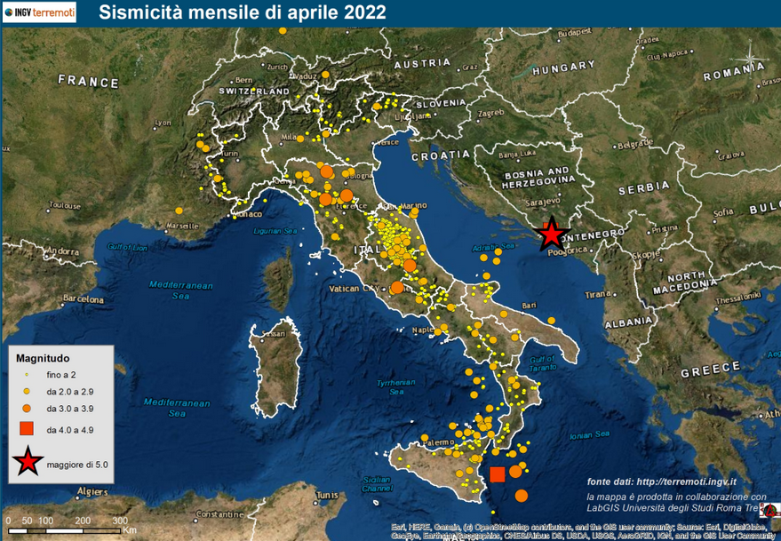 Il terremoto più forte di questo mese, ML 6.0, è stato localizzato al di fuori dei confini nazionali, in Bosnia-Erzegovina, alle ore 23:07 italiane del 22 aprile 2022 con epicentro a circa 60 km a sud di Mostar. L’evento, seguito nelle ore e nei giorni successivi da diverse repliche anche di magnitudo rilevanti (ML 5.1 e ML 4.4) è stato ampiamente risentito sul territorio italiano, in tutta la costa adriatica ed in gran parte delle regioni centro-meridionali, come si evince dalla mappa preliminare degli effetti del terremoto ricavata dai questionari arrivati al sito www.haisentitoilterremoto.it. Il 15 aprile un terremoto di magnitudo ML 4.2è stato registrato alle ore 3:34 nel mar Ionio, al largo della costa siracusana a circa 42 km da Siracusa, 38 km da Augusta (SR) e 52 km da Catania con ipocentro a una profondità di circa 33 km. Questo evento è stato avvertito in Sicilia sud-orientale, in particolare, nelle città di Catania e Siracusa. Da ricordare anche altri due eventi sismici avvenuti in questo mese di aprile: il terremoto dell’11 aprile, ML 3.4, localizzato in provincia di Roma, a Ciciliano, con risentimenti nella città di Roma e dintorni e il terremoto del 19 aprile, Mw 3.7, a Monghidoro, in provincia di Bologna.