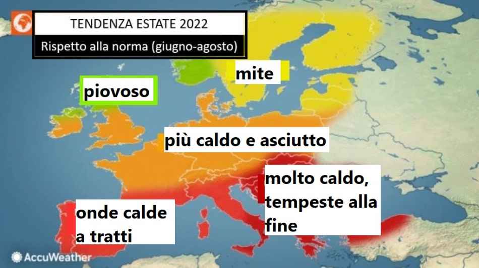 Cominciamo a divulgare subito le fonti: il noto sito “Accuweather” è formato da ESPERTI meteorologi e climatologi, che sovente studiano gli andamenti nel lungo termine. Abbiam già rammentato più e più volte che non potremo mai sapere come sarà il 22 luglio in Veneto o in Sicilia, ma possiamo dire, in termini di larghe vedute, se l’estate sarà più o meno calda e/o asciutta. Teniamo altresì a precisare, qualora non fosse chiaro, che questi lavori son ancora sperimentali e quindi NON van presi come certezze.