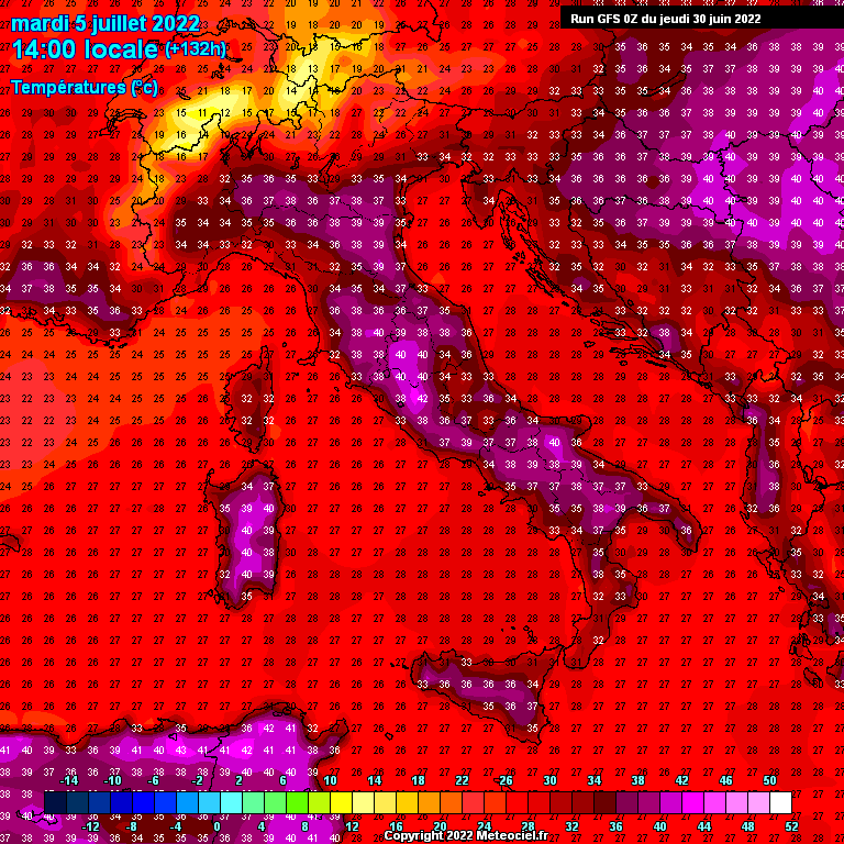 Massime sopra 35°C su tutta Italia, tranne Piemonte, Liguria, Abruzzo, Molise. Valori di 36-38°C su resto del Nord Italia, interno Marche-Lazio, Umbria; 39-41°C su interno Toscana e zone interno di tutto il Sud e delle Isole