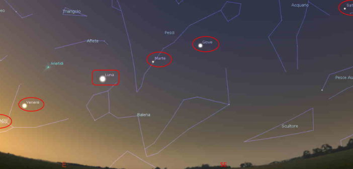 Questa “concentrazione di astri” non particolarmente frequente potrebbe “culminare” in una presenza contemporanea di 5 pianeti con la Luna all’alba del 24 giugno con Mercurio, sempre basso all’orizzonte e Saturno in realtà un po’ più spostato (che comunque per la sua osservazione, pur teoricamente possibile a occhio nudo, è sempre consigliabile almeno un buon binocolo).