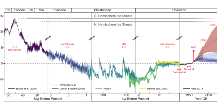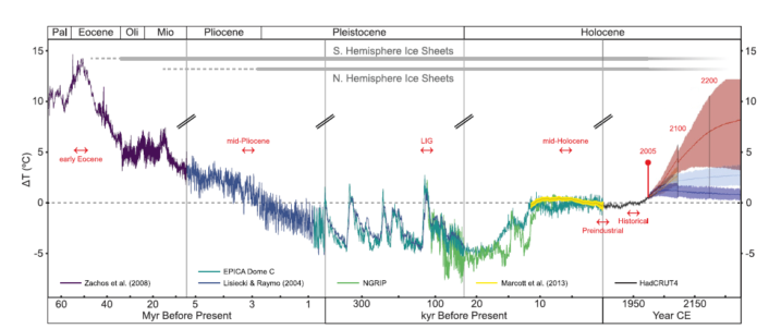 I dati sul cambiamento climatico di questi ultimi decenni indicano che viviamo in una situazione pericolosa, che potrebbe portare nel futuro le concentrazioni di gas serra in atmosfera a valori analoghi a quelli di alcuni periodi caldi del lontano passato geologico. L’analogo più recente è quello del periodo caldo del Pliocene medio, tra i 3 e 3.3 milioni di anni fa. A quell’epoca la concentrazione stimata di CO2 è di 450 ppm e il livello medio del mare era tra i 10 e i 20 m più alto dell’attuale con una temperatura globale più alta di circa 3°C.