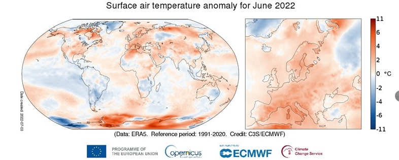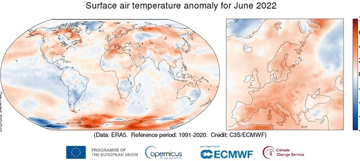 I nuovi dati raccolti da Copernicus – il programma di punta per l’osservazione della Terra offerto dall’Unione europea – documentano che a giugno 2022 la temperatura globale media è stata di 0.31°C più elevata rispetto alla media registrata tra il 1991 e il 2020, rendendolo così il terzo giugno più caldo di sempre.