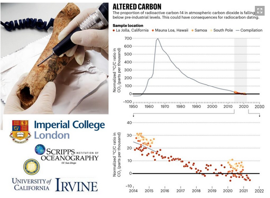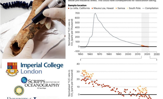 Nel 2015, la ricercatrice Heather Graven, del Dipartimento di fisica dell’Imperial College London, aveva previsto nello studio “Impact of fossil fuel emissions on atmospheric radiocarbon and various applications of radiocarbon over this century” pubblicato su PNAS che presto i livelli di 14C/C sarebbero arrivati al di sotto dei livelli preindustriali, il che significa che i materiali più recenti potrebbero essere erroneamente datati come più vecchi di quanto siano in realtà. Il nuovo studio “Radiocarbon dating: going back in time”, pubblicato su Nature dalla Graven in collaborazione con Ralph Keeling (Scripps Institution of Oceanography) e Xiaomei Xu (università della California – Irvine), conferma che è proprio quel che sta avvenendo e che «Questo ha implicazioni per l’archeologia e la medicina legale, che si basano sulla datazione al carbonio».