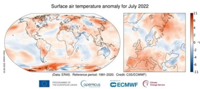A livello globale, questo del 2022 è uno dei tre mesi di luglio più caldi mai registrati, quasi 0.4 °C al di sopra della media per il periodo di riferimento tra il 1991 e il 2020, leggermente più fresco di luglio 2019 e leggermente più caldo di luglio 2016; le temperature sono state invece inferiori alla media lungo l’Oceano Indiano occidentale, dal Corno d’Africa all’India meridionale fino a gran parte dell’Asia centrale, così come in quasi tutta l’Australia.