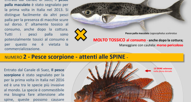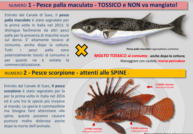 Il pesce scorpione (Pterois miles), è stato segnalato per la prima volta in Italia nel 2016 ed è una tra le specie più invasive al mondo, conosciuta anche per aver colonizzato gran parte delle coste Atlantiche occidentali con imponenti impatti ecologici. La specie è commestibile ma bisogna fare attenzione alle spine, queste possono causare punture molto dolorose anche 48 ore dopo la morte dell’animale.