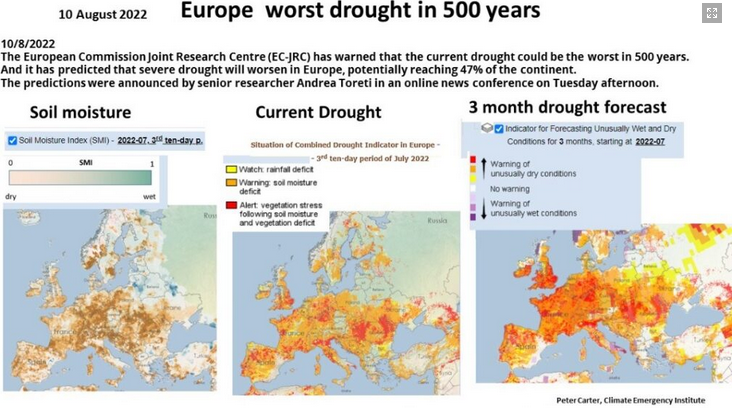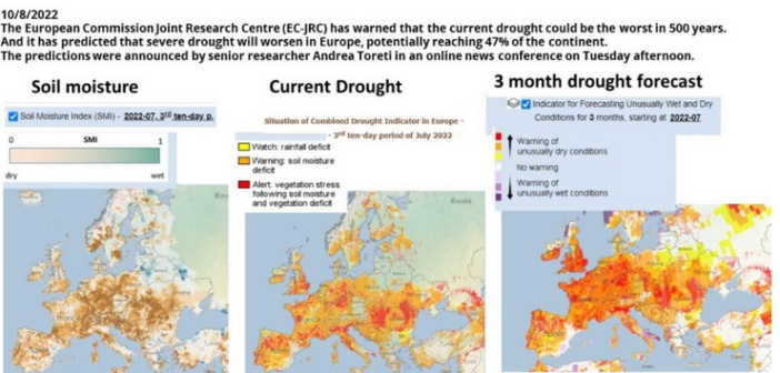 In un’intervista a Sky News 24 rilanciata anche dal Washington Post, Andrea Toreti, ricercatore senior del Joint Research Centre (JRC) della Commissione europea e che processa i dati dell’European Drought Observatory (EDO), ha detto che «Quest’anno è destinato ad essere ancora peggiore rispetto al 2018, quando condizioni insolitamente favorevoli in alcune parti del blocco [europeo]lo hanno protetto dalla siccità altrove, e il peggiore dal XVI secolo». E ha aggiunto «Al momento… questo sembra essere l’anno peggiore degli ultimi 500 anni, anche se un’analisi completa dovrà avvenire retrospettivamente. Non abbiamo analizzato completamente l’evento, ma in base alla mia esperienza penso che questo sia forse ancora più estremo rispetto al 2018. Il 2018 è stato così estremo che guardando indietro a questo elenco degli ultimi 500 anni, non ci sono stati altri eventi simili»