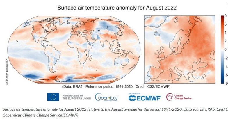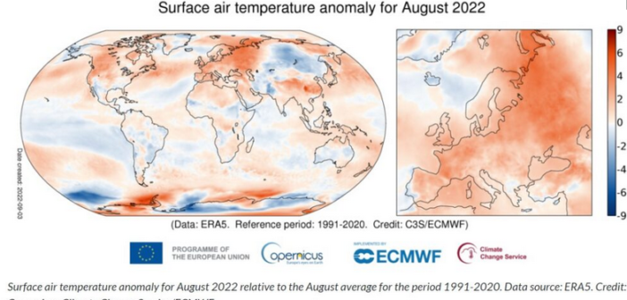 Secondo il bollettino mensile pubblicato da Copernicus Climate Change Service (C3S), implementato dall’European Centre for Medium-Range Weather Forecasts  per conto della Commissione europea,  «A livello globale la temperatura media di agosto 2022 è stata: 0.3° C più elevata della media 1991-2020 per il mese, risultando complessivamente il terzo agosto più caldo mai registrato; simile ai valori dell’agosto 2017 e 2021 ed entro lo 0.1°C rispetto ai valori più alti raggiunti nell’agosto 2016 e 2019. La temperatura media in Europa è stata: la più alta mai registrata sia per il mese di agosto che per tutta l’estate (giugno-agosto), con margini sostanziali di 0.8°C rispetto al 2018 per agosto e di 0.4°C rispetto al 2021 per tutta l’estate; le temperature europee sono state superiori alla media in particolar modo nella parte orientale del continente in agosto, ma erano ancora ben al di sopra della media nel sud-ovest, dove erano già state elevate anche nel corso di giugno e luglio; le ondate di calore si sono concentrate in questa parte dell’Europa e nella Cina centrale e orientale per tutti e tre i mesi estivi. Anche l’America settentrionale ha registrato una delle sue estati più calde di sempre.