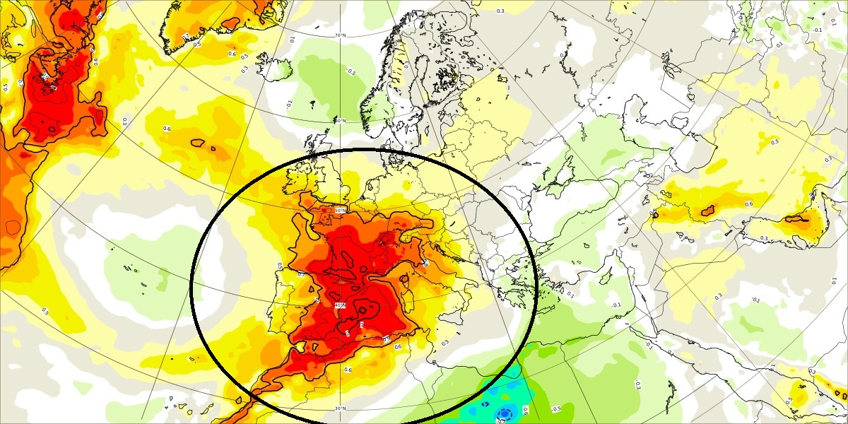 Stiamo per subire un’anomalia veramente storica per estensione ed intensità. Non guardiamo solamente al nostro territorio, ma diamo un’occhiata a livello europeo. Cosa notiamo? Un’enorme macchia rossa che coinvolge quasi tutta l’Europa occidentale. Quello che il lettore può vedere nella cartina è l’EFI Index, un particolare indice meteo che ci dice l’eccezionalità del periodo in esame. Il rosso scuro sta a significare che non ha mai fatto così caldo in questo periodo dell’anno in una determinata area. E tutti possono vedere quanto è estesa quell’area: migliaia di chilometri quadrati!