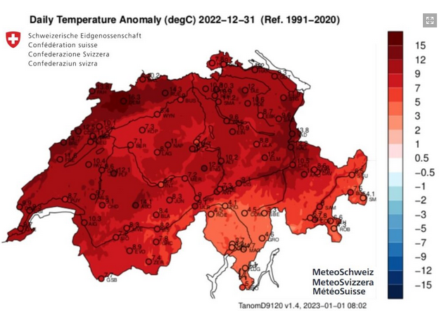 Regno Unito, Irlanda, Francia e Spagna hanno dichiarato il 2022 l’anno più caldo mai registrato e anche in Svizzera il 2022 è stato l’anno più caldo dall’inizio delle misurazioni delle temperature si è concluso come era iniziato: con temperature di gran lunga superiori alla media. Nell’ultima giornata del 2022, in alcune località l’anomalia della temperatura media giornaliera ha superato di oltre 16 gradi la norma 1991-2020, come per esempio a Delémont, dove le temperature minime e massime sono state rispettivamente di 11,5° C e 20,9° C. MeteoSvizzera fanno notare che «Questi valori si situano di poco sotto i massimi assoluti per il mese di dicembre. La temperatura media del 31 dicembre 2022 corrispondeva alla media del mese di giugno».
