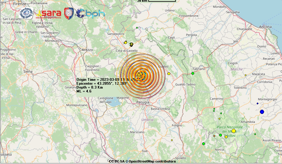 Una nuova doppia scossa di terremoto di ML 4.6 e ML 3.9 sono avvenute alle ore 20:08:05 e alle ore 20:13:56 italiane nella zona di Umbertide (PG) in Umbria con ipocentro con ipocentri compresi tra la profondità di 8 e 10 km.