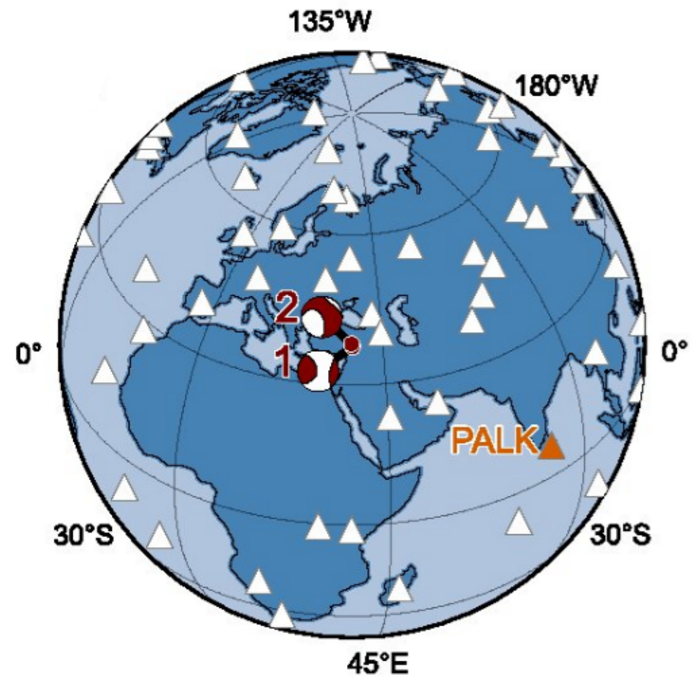 Le 2 scosse del 6 febbraio 2023 in Turchia rappresentano la coppia più intensa mai registrata sulla terraferma; mappa della distribuzione delle stazioni di rilevamento (fonte: Earthquake Science (2023). DOI: 10.1016/j.eqs.2023.02.008)