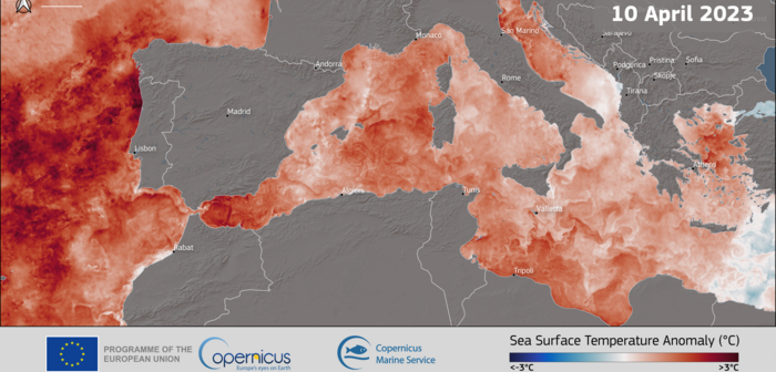 Il Mar Mediterraneo e l’Oceano Atlantico orientale non sono mai stati così caldi, un record ben visibile anche dallo spazio: le immagini fornite dai satelliti europei Copernicus, grazie al servizio di monitoraggio dell’ambiente marino (Cmems), mostrano che le temperature relative alla superficie del mare sono ben 3 gradi sopra i normali valori di riferimento per la data del 10 aprile.