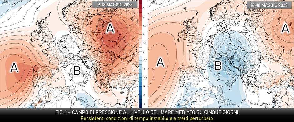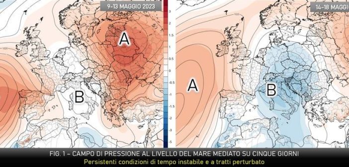 Chiusa tra due figure antagoniste di alta pressione, la buca barica che andrà scavandosi sulla nostra penisola si troverà impossibilitata a traslare verso ogni direzione e quindi sarà costretta a esaurire a più riprese i propri fenomeni sulle nostre regioni, impegnando così alternativamente più settori almeno fino alla fine della seconda decade di maggio (fig. 1). Come abbiamo già anticipato, saranno infatti diversi gli impulsi instabili che cadranno all’interno di questa circolazione ciclonica e quindi è realistico pensare che, giorno dopo giorno, vadano aumentando le cumulate complessive delle piogge.