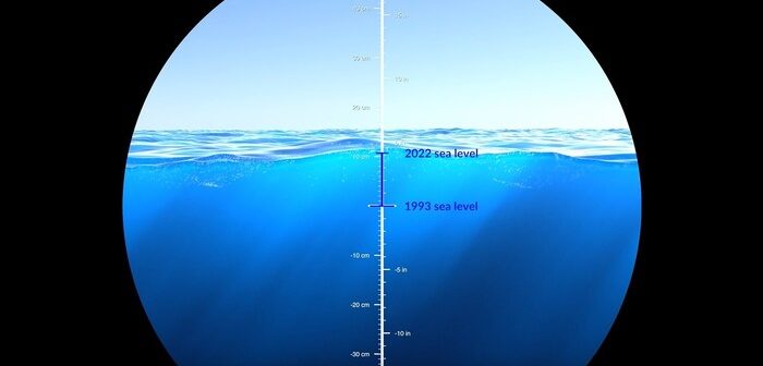 Le misurazioni effettuate dai satelliti tra il 1993 e il 2022 dimostrano che il livello dei mari è aumentato globalmente di 9 centimetri: questa variazione espressa con i numeri può sembrare modesta, ma assume tutt’altro significato e diventa ancora più concreta se viene visualizzata sotto forma di acqua che va progressivamente a sommergere l’oblò di una nave.