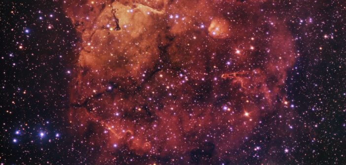 Questa spettacolare immagine della nebulosa Sh2-284 è stata catturata con grande dettaglio dal Vst (Vlt Survey Telescope) all’Osservatorio del Paranal dell’Eso. Sh2-284 è una regione di formazione stellare, con un ammasso di giovani stelle, Dolidze 25, al centro. La radiazione di questo ammasso è abbastanza potente da ionizzare l’idrogeno gassoso contenuto nella nebulosa. È questa ionizzazione che produce i brillanti colori arancione e rosso. Crediti: Eso/Vphas+ team. Acknowledgement: Casu