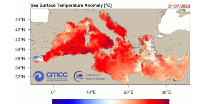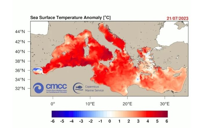 I dati messi in fila dal Centro euro-mediterraneo sui cambiamenti climatici (Cmcc) mostrano infatti che le temperature superficiali nel bacino del Mediterraneo sono attualmente più calde del solito, raggiungendo livelli fino a 5-6°C al di sopra della media climatologica di luglio.