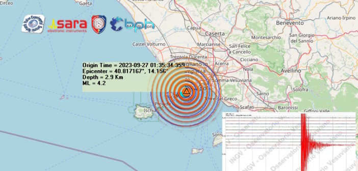 Un terremoto di magnitudo (Md) 4.2 è avvenuto alle ore 03:35:34 ed è stato localizzato nella zona dei Campi Flegrei, nella zona di Pozzuoli (NA) in Campania, con ipocentro alla profondità di 2.9 km.