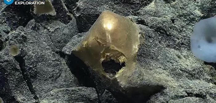 L’oggetto, liscio con un foro al centro, è stato trovato ad una profondità di circa 3 chilometri da un sottomarino telecomandato, e secondo i ricercatori della National Oceanic and Atmospheric Administration (Noaa) statunitense, che hanno fatto la scoperta, potrebbe trattarsi di un uovo schiuso o di una spugna marina.