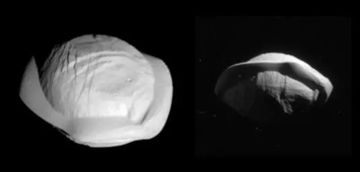 Pan, come l’altra luna di Saturno Atlante, ha una prominente cresta equatoriale che le conferisce una caratteristica forma a disco volante – o raviolo, se vogliamo, e questo spiega la particolarità di queste immagini diffuse dalla NASA.